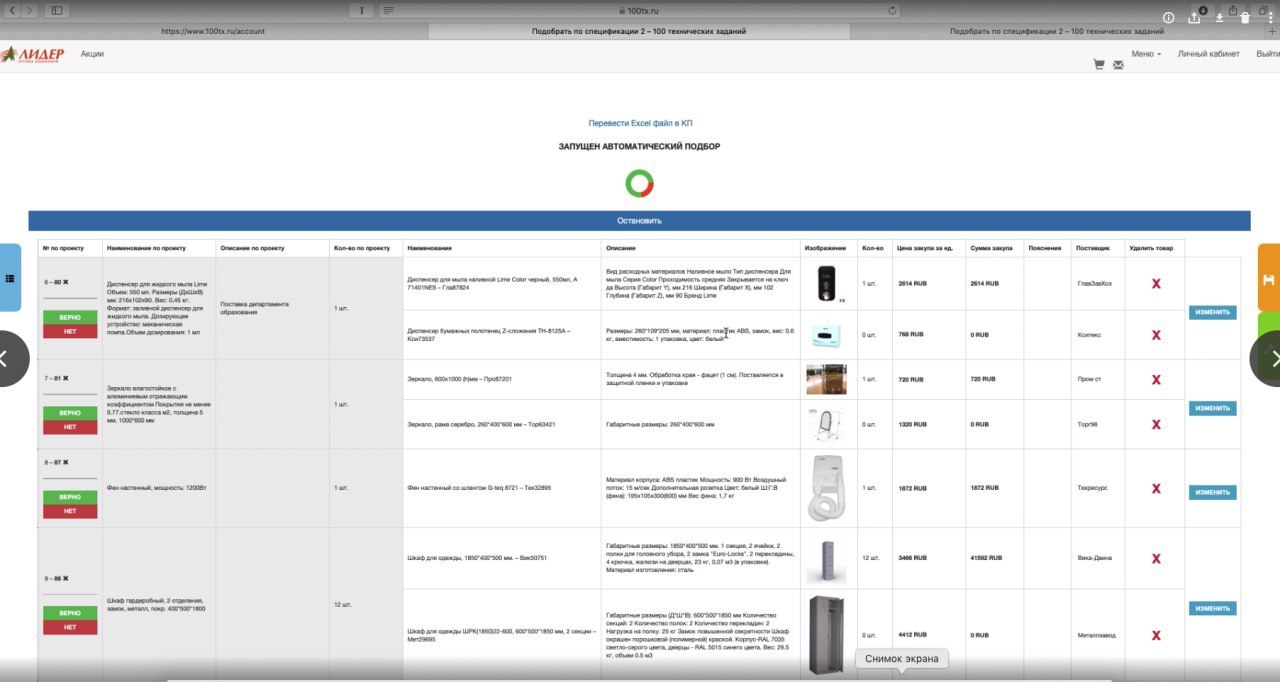 Сегодня мы умеем подбирать товары по спецификациям в автоматическом режиме и раздавать заказ по частям в личные кабинеты Производителей, которые профессионально проверяют и выдают предложения в систему. В будущем мы полностью автоматизируем процесс закупок.